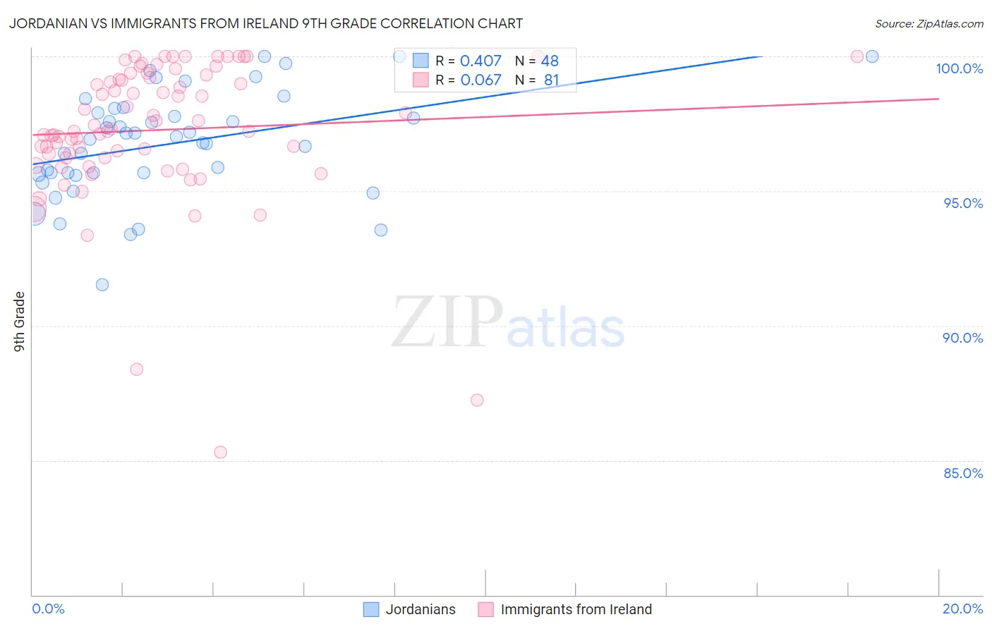 Jordanian vs Immigrants from Ireland 9th Grade Correlation Chart