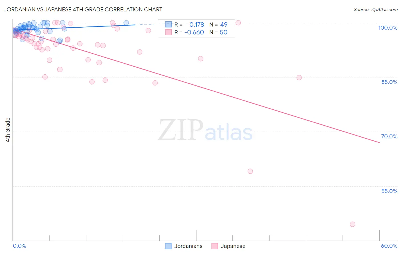 The statistical analysis conducted on geographies consisting of 166,424,117 people shows a poor positive correlation between the proportion of Jordanians and percentage of population with at least 4th grade education in the United States with a correlation coefficient (R) of 0.178 and weighted average of 97.7%. Similarly, the statistical analysis conducted on geographies consisting of 249,183,224 people shows a significant negative correlation between the proportion of Japanese and percentage of population with at least 4th grade education in the United States with a correlation coefficient (R) of -0.660 and weighted average of 96.0%, a difference of 1.7%.