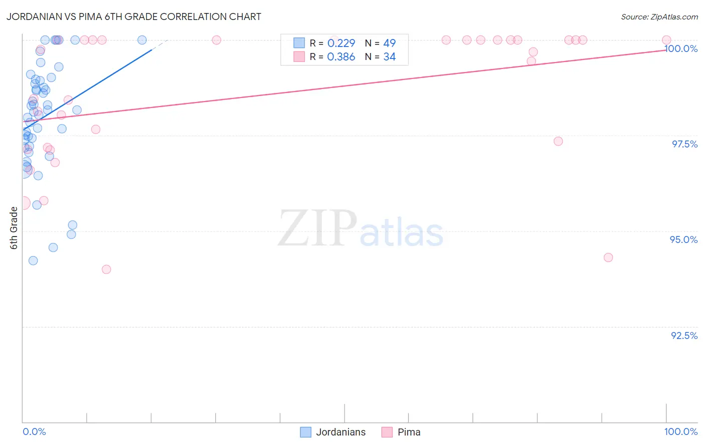 The statistical analysis conducted on geographies consisting of 166,424,117 people shows a weak positive correlation between the proportion of Jordanians and percentage of population with at least 6th grade education in the United States with a correlation coefficient (R) of 0.229 and weighted average of 97.2%. Similarly, the statistical analysis conducted on geographies consisting of 61,552,942 people shows a mild positive correlation between the proportion of Pima and percentage of population with at least 6th grade education in the United States with a correlation coefficient (R) of 0.386 and weighted average of 97.2%, a difference of 0.010%.