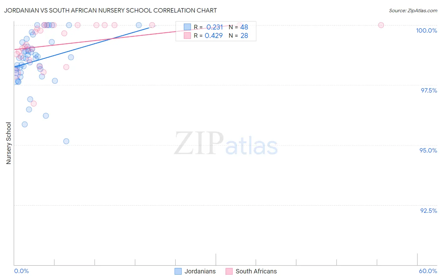 The statistical analysis conducted on geographies consisting of 166,423,717 people shows a weak positive correlation between the proportion of Jordanians and percentage of population with at least nursery school education in the United States with a correlation coefficient (R) of 0.231 and weighted average of 98.1%. Similarly, the statistical analysis conducted on geographies consisting of 182,602,894 people shows a moderate positive correlation between the proportion of South Africans and percentage of population with at least nursery school education in the United States with a correlation coefficient (R) of 0.429 and weighted average of 98.3%, a difference of 0.24%.