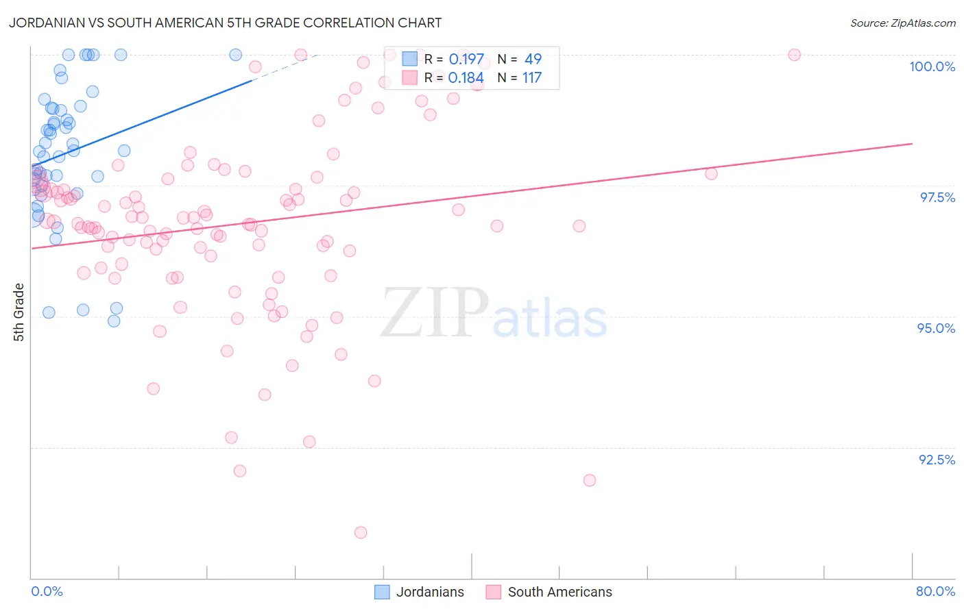 In terms of 5th grade, the demographic groups most similar to Jordanians are Immigrants from Greece (97.5%, a difference of 0.0%), Spaniard (97.5%, a difference of 0.0%), Soviet Union (97.5%, a difference of 0.010%), Israeli (97.5%, a difference of 0.020%), and Immigrants from North Macedonia (97.5%, a difference of 0.020%).