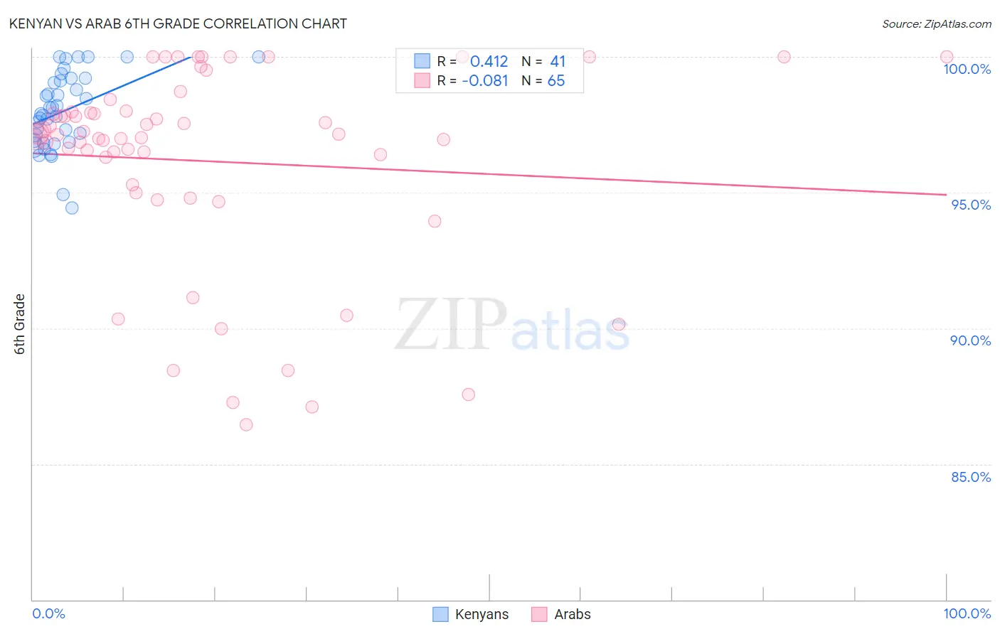 In terms of 6th grade, the demographic groups most similar to Kenyans are Immigrants from Iran (97.1%, a difference of 0.0%), Ugandan (97.1%, a difference of 0.0%), Immigrants from Belarus (97.1%, a difference of 0.010%), Marshallese (97.1%, a difference of 0.010%), and Immigrants from Russia (97.1%, a difference of 0.020%). Similarly, the demographic groups most similar to Arabs are Egyptian (97.1%, a difference of 0.0%), Venezuelan (97.0%, a difference of 0.0%), Bermudan (97.1%, a difference of 0.010%), Chilean (97.1%, a difference of 0.010%), and Immigrants from Sri Lanka (97.1%, a difference of 0.010%).