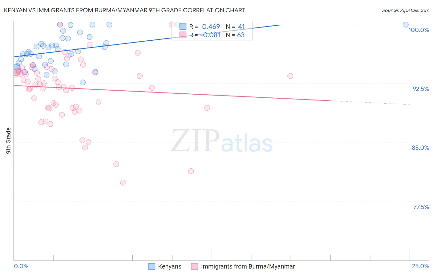 The statistical analysis conducted on geographies consisting of 168,244,042 people shows a moderate positive correlation between the proportion of Kenyans and percentage of population with at least 9th grade education in the United States with a correlation coefficient (R) of 0.469 and weighted average of 95.1%. Similarly, the statistical analysis conducted on geographies consisting of 172,345,696 people shows a slight negative correlation between the proportion of Immigrants from Burma/Myanmar and percentage of population with at least 9th grade education in the United States with a correlation coefficient (R) of -0.081 and weighted average of 93.1%, a difference of 2.1%.