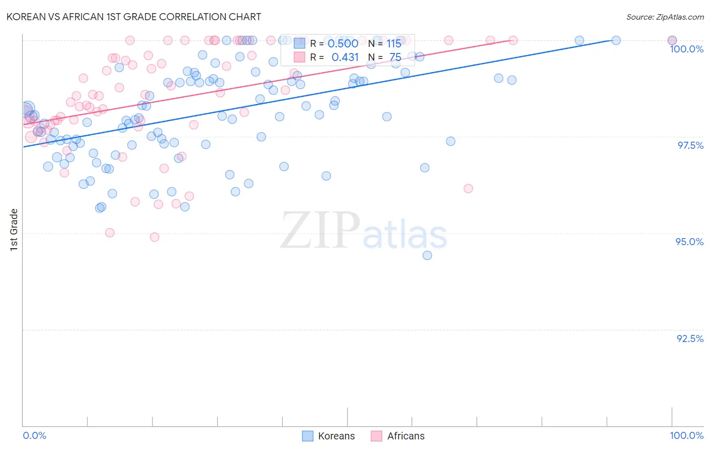 In terms of 1st grade, the demographic groups most similar to Koreans are Immigrants from Eastern Asia (97.6%, a difference of 0.0%), Liberian (97.6%, a difference of 0.0%), Nigerian (97.6%, a difference of 0.010%), U.S. Virgin Islander (97.6%, a difference of 0.020%), and Immigrants from Indonesia (97.6%, a difference of 0.020%).
