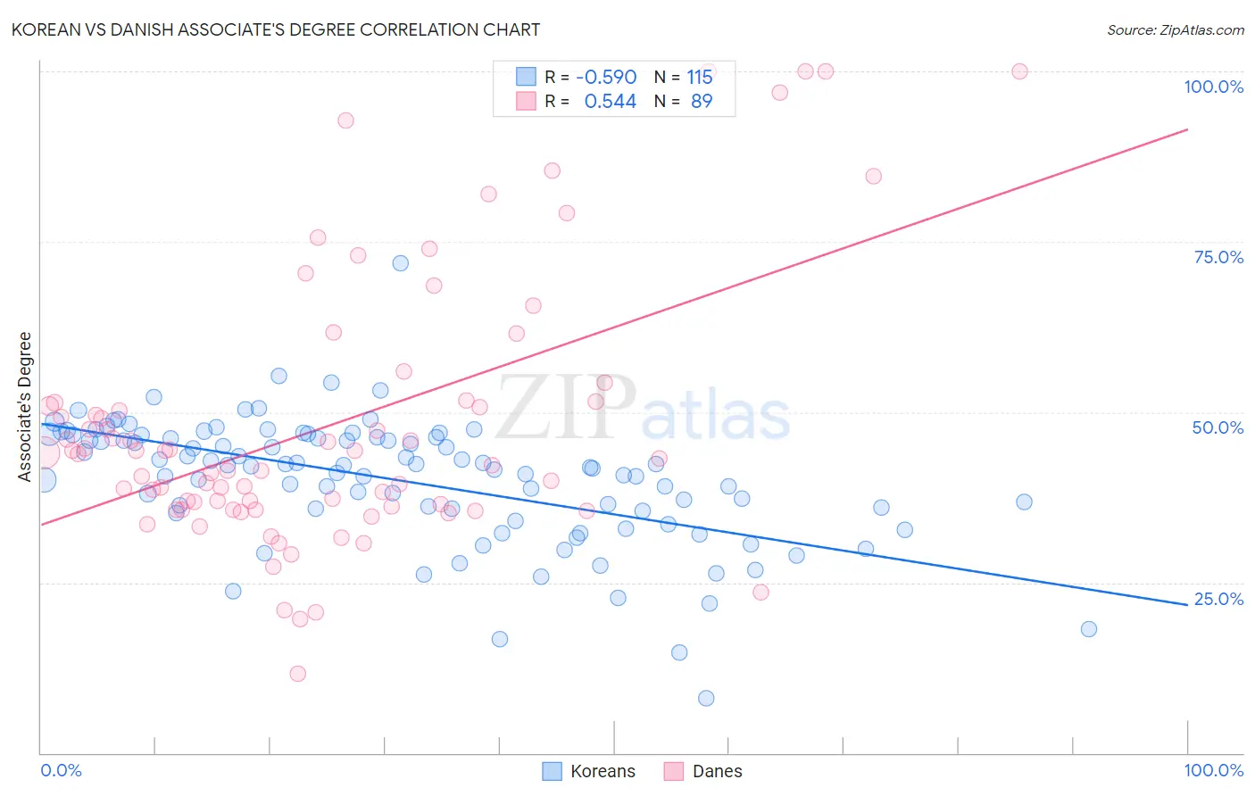 The statistical analysis conducted on geographies consisting of 510,898,568 people shows a substantial negative correlation between the proportion of Koreans and percentage of population with at least associate's degree education in the United States with a correlation coefficient (R) of -0.590 and weighted average of 45.8%. Similarly, the statistical analysis conducted on geographies consisting of 474,170,437 people shows a substantial positive correlation between the proportion of Danes and percentage of population with at least associate's degree education in the United States with a correlation coefficient (R) of 0.544 and weighted average of 47.4%, a difference of 3.6%.