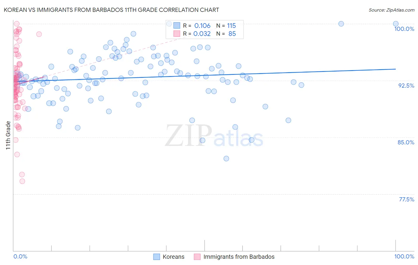 Korean vs Immigrants from Barbados 11th Grade Correlation Chart