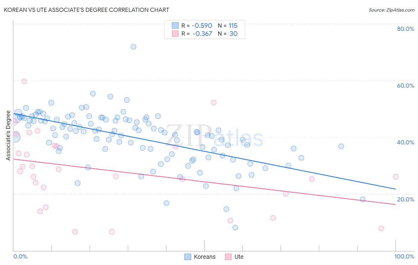 The statistical analysis conducted on geographies consisting of 510,898,568 people shows a substantial negative correlation between the proportion of Koreans and percentage of population with at least associate's degree education in the United States with a correlation coefficient (R) of -0.590 and weighted average of 45.8%. Similarly, the statistical analysis conducted on geographies consisting of 55,668,197 people shows a mild negative correlation between the proportion of Ute and percentage of population with at least associate's degree education in the United States with a correlation coefficient (R) of -0.367 and weighted average of 38.6%, a difference of 18.5%.