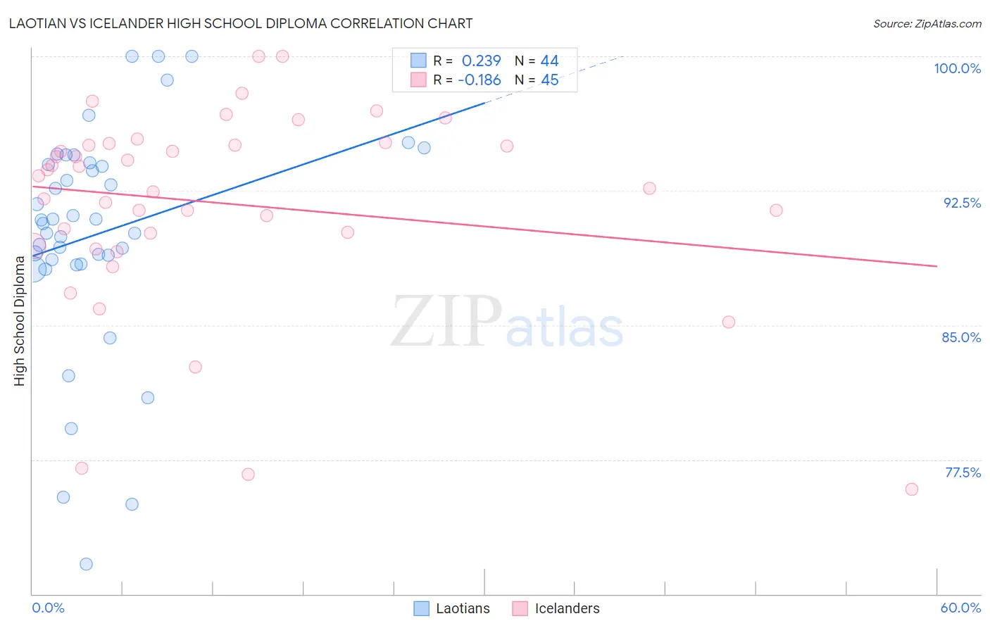 The statistical analysis conducted on geographies consisting of 224,854,130 people shows a weak positive correlation between the proportion of Laotians and percentage of population with at least high school diploma education in the United States with a correlation coefficient (R) of 0.239 and weighted average of 89.3%. Similarly, the statistical analysis conducted on geographies consisting of 159,668,816 people shows a poor negative correlation between the proportion of Icelanders and percentage of population with at least high school diploma education in the United States with a correlation coefficient (R) of -0.186 and weighted average of 90.5%, a difference of 1.4%.