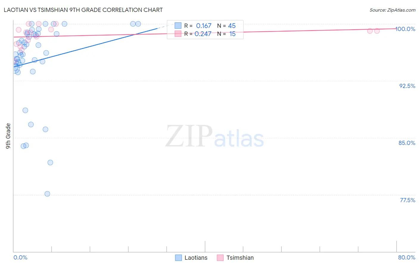 The statistical analysis conducted on geographies consisting of 224,856,886 people shows a poor positive correlation between the proportion of Laotians and percentage of population with at least 9th grade education in the United States with a correlation coefficient (R) of 0.167 and weighted average of 94.6%. Similarly, the statistical analysis conducted on geographies consisting of 15,626,544 people shows a weak positive correlation between the proportion of Tsimshian and percentage of population with at least 9th grade education in the United States with a correlation coefficient (R) of 0.247 and weighted average of 97.0%, a difference of 2.5%.