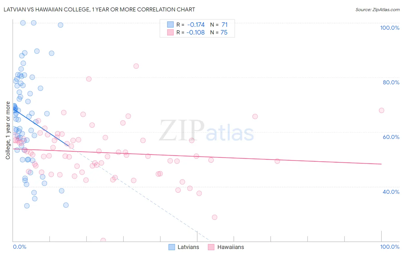 Latvian vs Hawaiian College, 1 year or more Correlation Chart