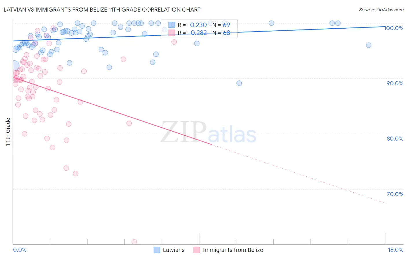 Latvian vs Immigrants from Belize 11th Grade Correlation Chart