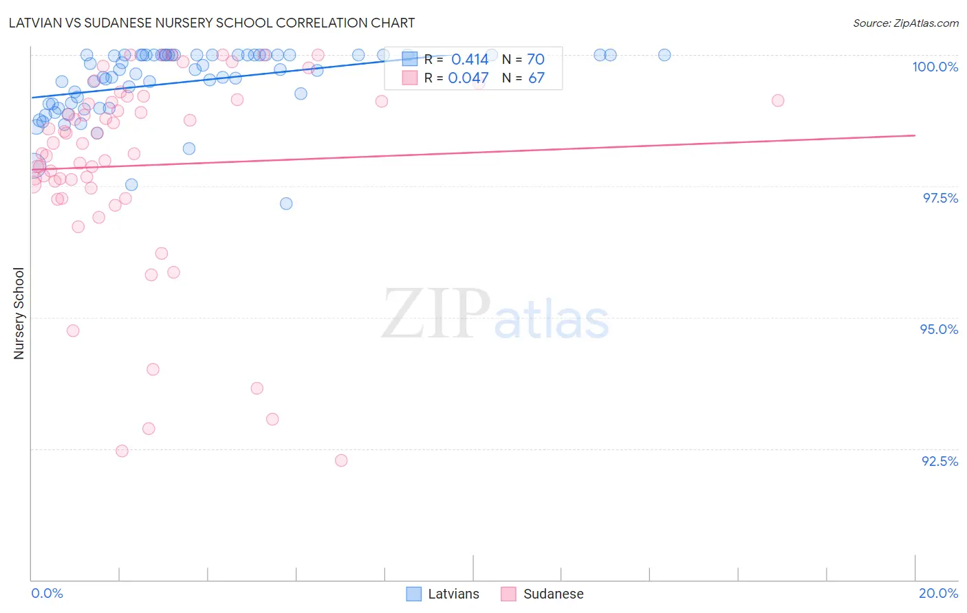 The statistical analysis conducted on geographies consisting of 220,726,452 people shows a moderate positive correlation between the proportion of Latvians and percentage of population with at least nursery school education in the United States with a correlation coefficient (R) of 0.414 and weighted average of 98.5%. Similarly, the statistical analysis conducted on geographies consisting of 110,145,984 people shows no correlation between the proportion of Sudanese and percentage of population with at least nursery school education in the United States with a correlation coefficient (R) of 0.047 and weighted average of 97.7%, a difference of 0.81%.