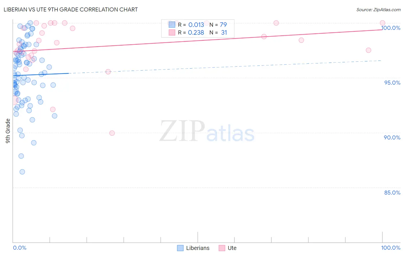 In terms of 9th grade, the demographic groups most similar to Liberians are Argentinean (94.8%, a difference of 0.0%), Immigrants from Nepal (94.8%, a difference of 0.020%), Immigrants from Uganda (94.8%, a difference of 0.040%), Sierra Leonean (94.8%, a difference of 0.040%), and Seminole (94.8%, a difference of 0.040%). Similarly, the demographic groups most similar to Ute are Blackfeet (95.0%, a difference of 0.0%), Immigrants from Brazil (95.0%, a difference of 0.010%), Chilean (95.0%, a difference of 0.010%), Spaniard (94.9%, a difference of 0.020%), and Alsatian (94.9%, a difference of 0.030%).