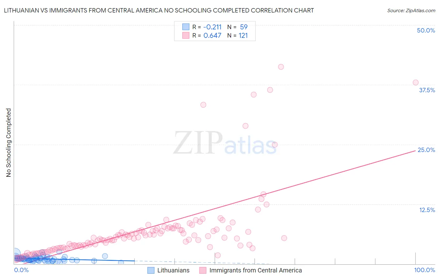 Lithuanian vs Immigrants from Central America No Schooling Completed Correlation Chart