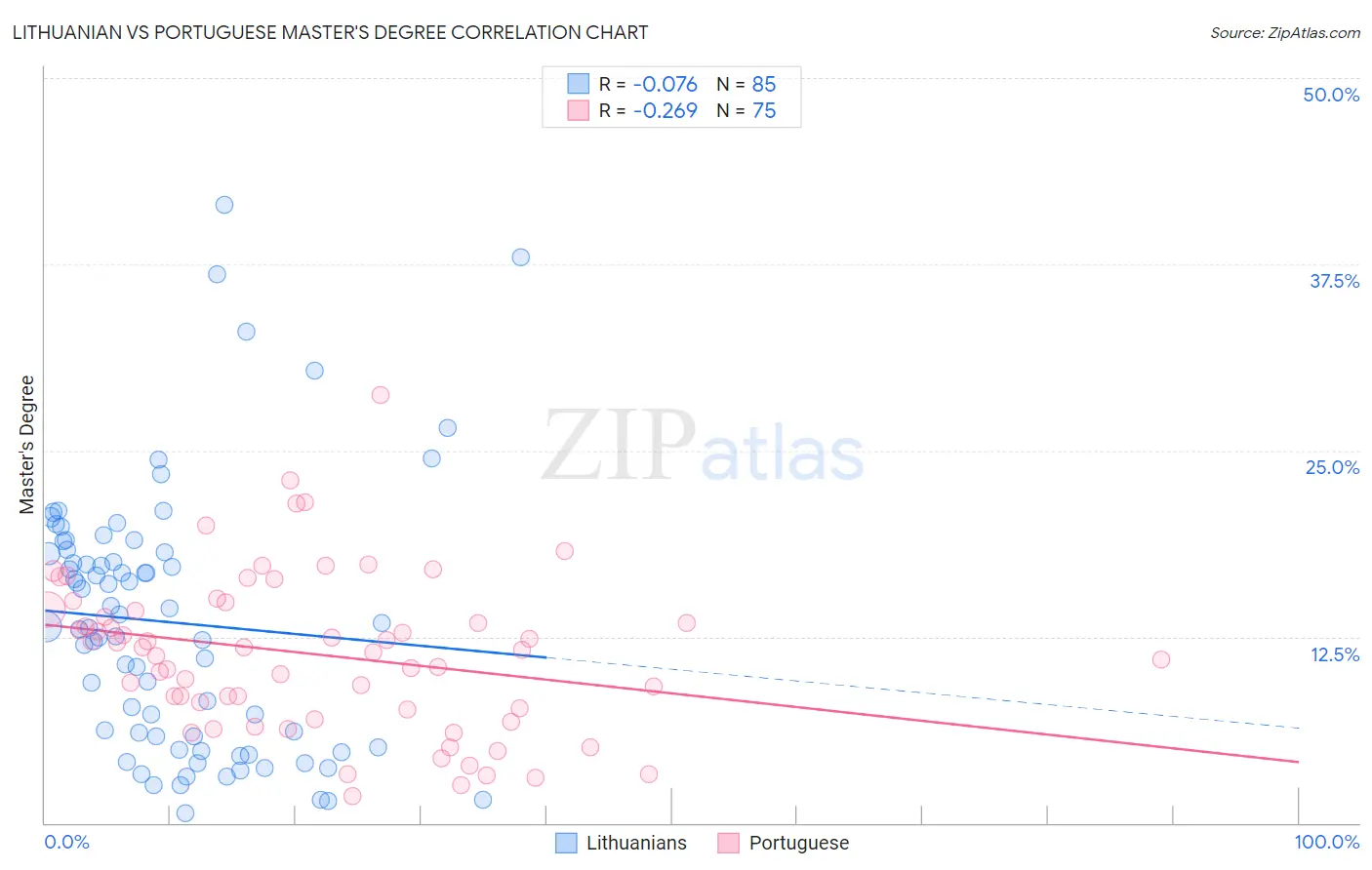 The statistical analysis conducted on geographies consisting of 421,813,641 people shows a slight negative correlation between the proportion of Lithuanians and percentage of population with at least master's degree education in the United States with a correlation coefficient (R) of -0.076 and weighted average of 17.7%. Similarly, the statistical analysis conducted on geographies consisting of 450,138,380 people shows a weak negative correlation between the proportion of Portuguese and percentage of population with at least master's degree education in the United States with a correlation coefficient (R) of -0.269 and weighted average of 13.9%, a difference of 27.4%.