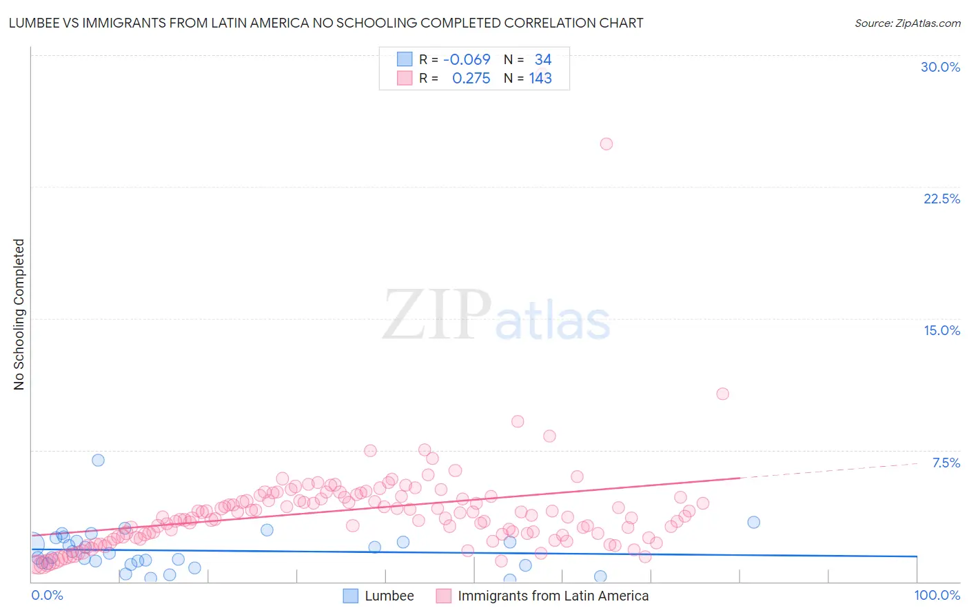 Lumbee vs Immigrants from Latin America No Schooling Completed Correlation Chart