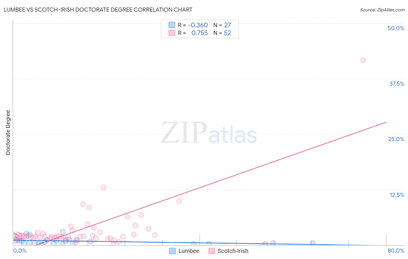 The statistical analysis conducted on geographies consisting of 91,789,296 people shows a mild negative correlation between the proportion of Lumbee and percentage of population with at least doctorate degree education in the United States with a correlation coefficient (R) of -0.360 and weighted average of 1.1%. Similarly, the statistical analysis conducted on geographies consisting of 527,994,945 people shows a strong positive correlation between the proportion of Scotch-Irish and percentage of population with at least doctorate degree education in the United States with a correlation coefficient (R) of 0.755 and weighted average of 1.9%, a difference of 72.3%.