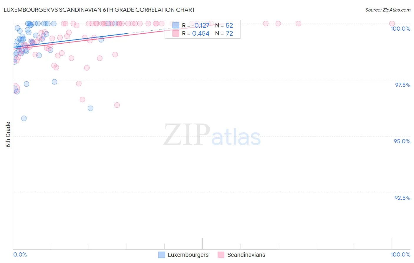 In terms of 6th grade, the demographic groups most similar to Luxembourgers are Belgian (97.9%, a difference of 0.0%), Latvian (97.9%, a difference of 0.010%), British (97.9%, a difference of 0.020%), Chinese (97.9%, a difference of 0.030%), and Italian (97.9%, a difference of 0.030%). Similarly, the demographic groups most similar to Scandinavians are Czech (98.0%, a difference of 0.0%), Yup'ik (98.0%, a difference of 0.0%), French (98.0%, a difference of 0.0%), French Canadian (98.0%, a difference of 0.010%), and European (98.0%, a difference of 0.010%).