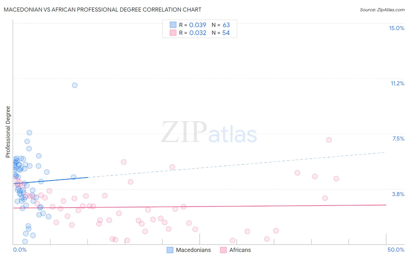 The statistical analysis conducted on geographies consisting of 132,425,938 people shows no correlation between the proportion of Macedonians and percentage of population with at least professional degree education in the United States with a correlation coefficient (R) of 0.039 and weighted average of 4.8%. Similarly, the statistical analysis conducted on geographies consisting of 467,688,066 people shows no correlation between the proportion of Africans and percentage of population with at least professional degree education in the United States with a correlation coefficient (R) of 0.032 and weighted average of 3.7%, a difference of 29.5%.