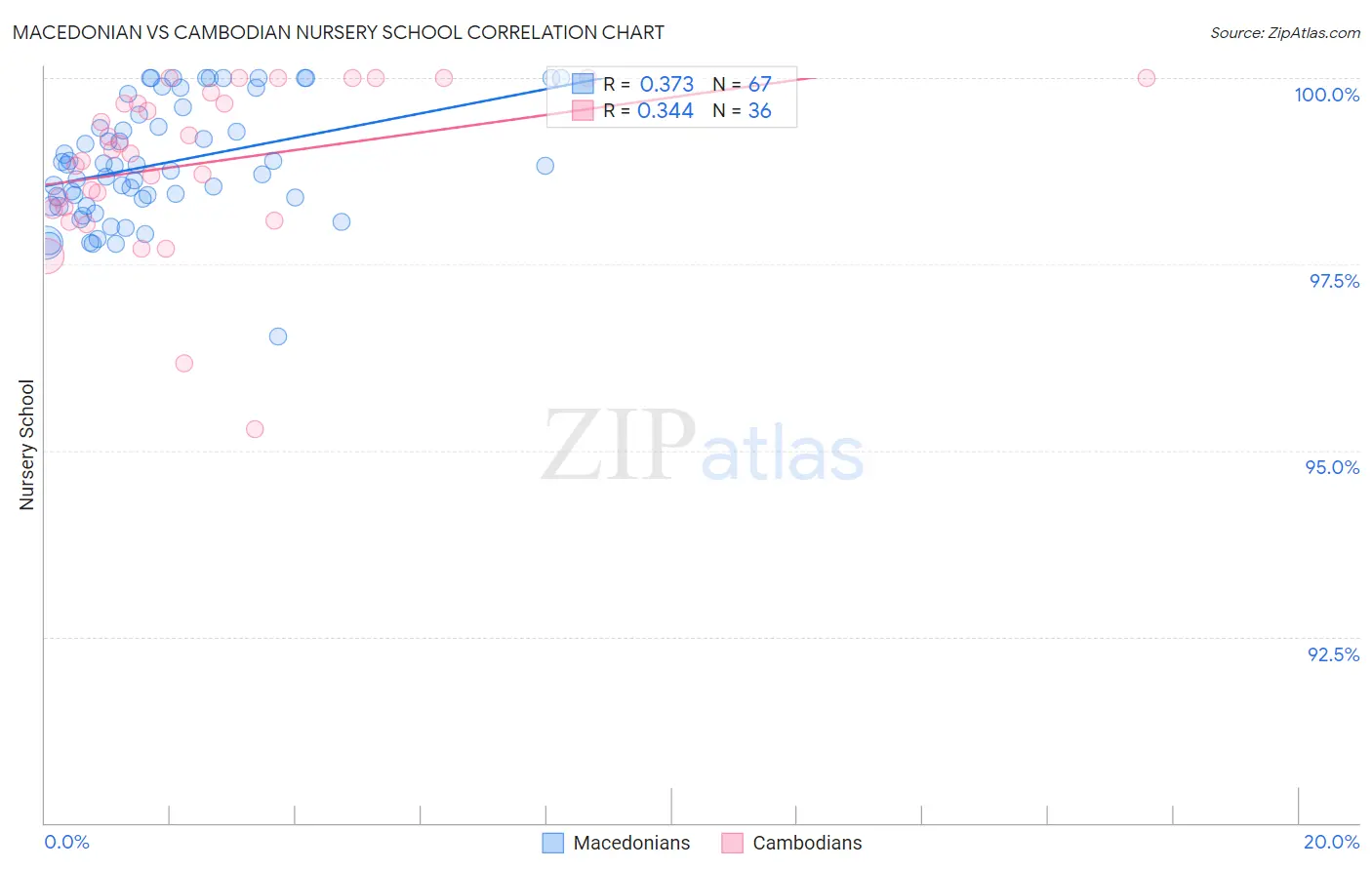 The statistical analysis conducted on geographies consisting of 132,590,497 people shows a mild positive correlation between the proportion of Macedonians and percentage of population with at least nursery school education in the United States with a correlation coefficient (R) of 0.373 and weighted average of 98.3%. Similarly, the statistical analysis conducted on geographies consisting of 102,511,743 people shows a mild positive correlation between the proportion of Cambodians and percentage of population with at least nursery school education in the United States with a correlation coefficient (R) of 0.344 and weighted average of 98.2%, a difference of 0.15%.