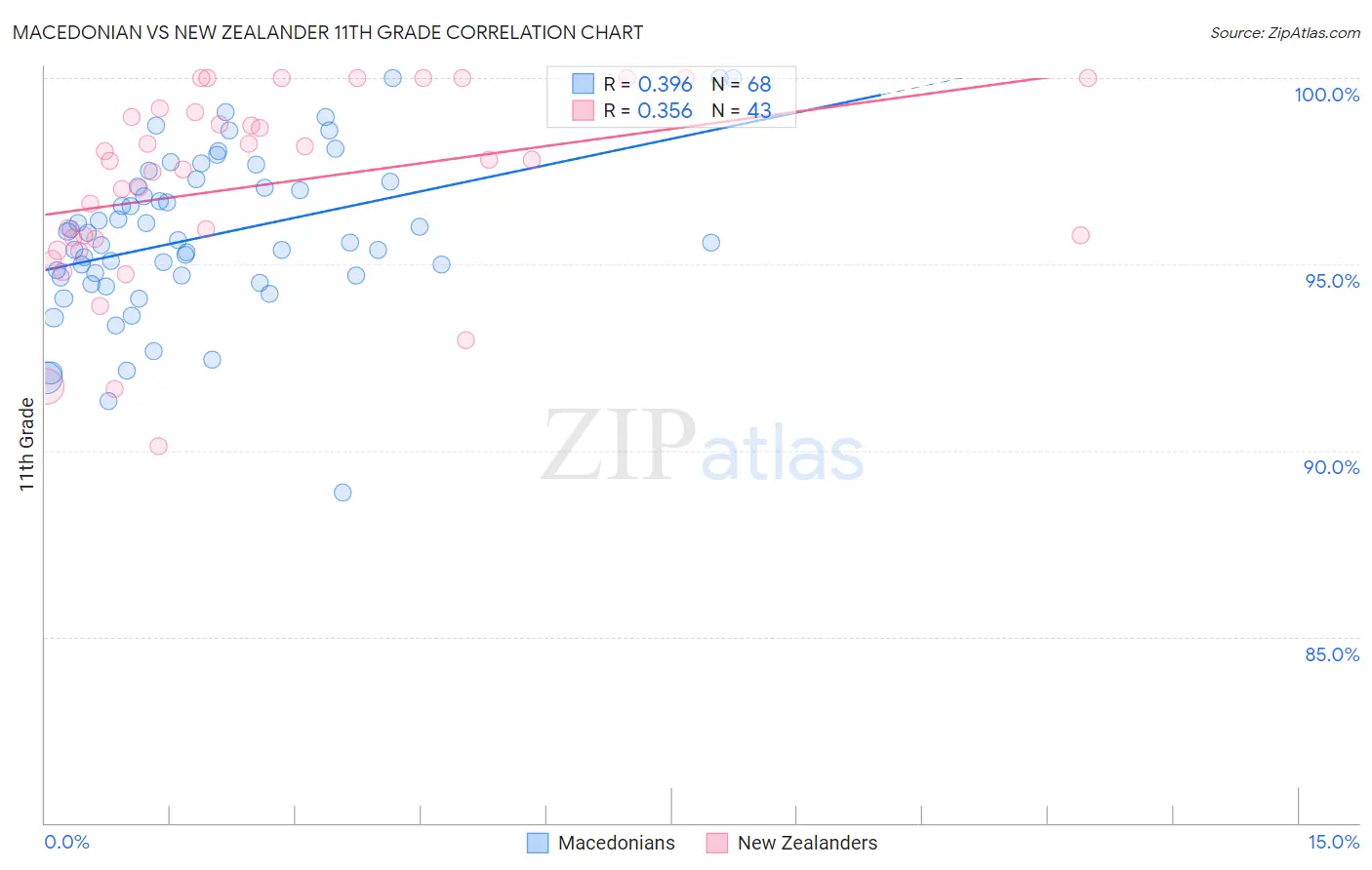 In terms of 11th grade, the demographic groups most similar to Macedonians are Filipino (94.1%, a difference of 0.0%), Slavic (94.1%, a difference of 0.0%), French (94.1%, a difference of 0.0%), Serbian (94.1%, a difference of 0.010%), and Australian (94.1%, a difference of 0.020%). Similarly, the demographic groups most similar to New Zealanders are French Canadian (94.0%, a difference of 0.0%), Iranian (94.0%, a difference of 0.0%), Bhutanese (94.0%, a difference of 0.0%), Okinawan (94.0%, a difference of 0.0%), and Immigrants from North America (94.0%, a difference of 0.010%).