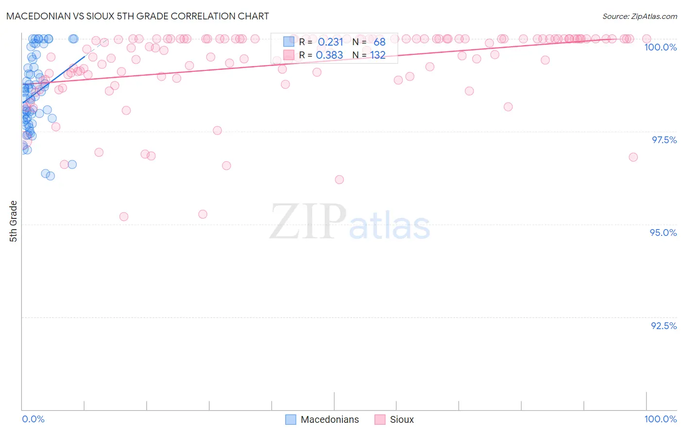 The statistical analysis conducted on geographies consisting of 132,592,860 people shows a weak positive correlation between the proportion of Macedonians and percentage of population with at least 5th grade education in the United States with a correlation coefficient (R) of 0.231 and weighted average of 97.9%. Similarly, the statistical analysis conducted on geographies consisting of 234,197,998 people shows a mild positive correlation between the proportion of Sioux and percentage of population with at least 5th grade education in the United States with a correlation coefficient (R) of 0.383 and weighted average of 98.2%, a difference of 0.36%.
