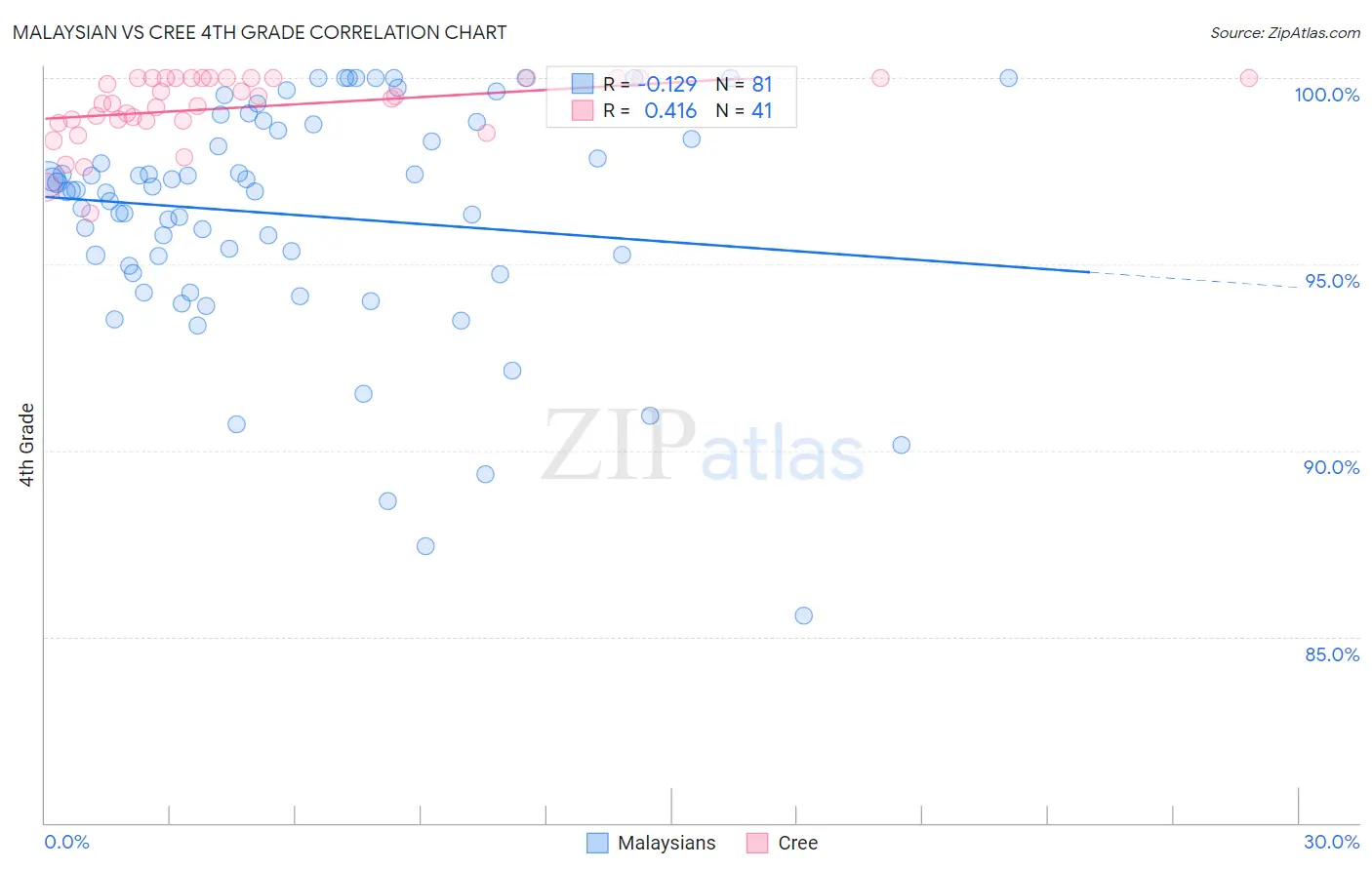 In terms of 4th grade, the demographic groups most similar to Cree are Yugoslavian (97.9%, a difference of 0.0%), South African (97.9%, a difference of 0.010%), Turkish (97.9%, a difference of 0.010%), Choctaw (97.9%, a difference of 0.010%), and Immigrants from Germany (97.9%, a difference of 0.020%).