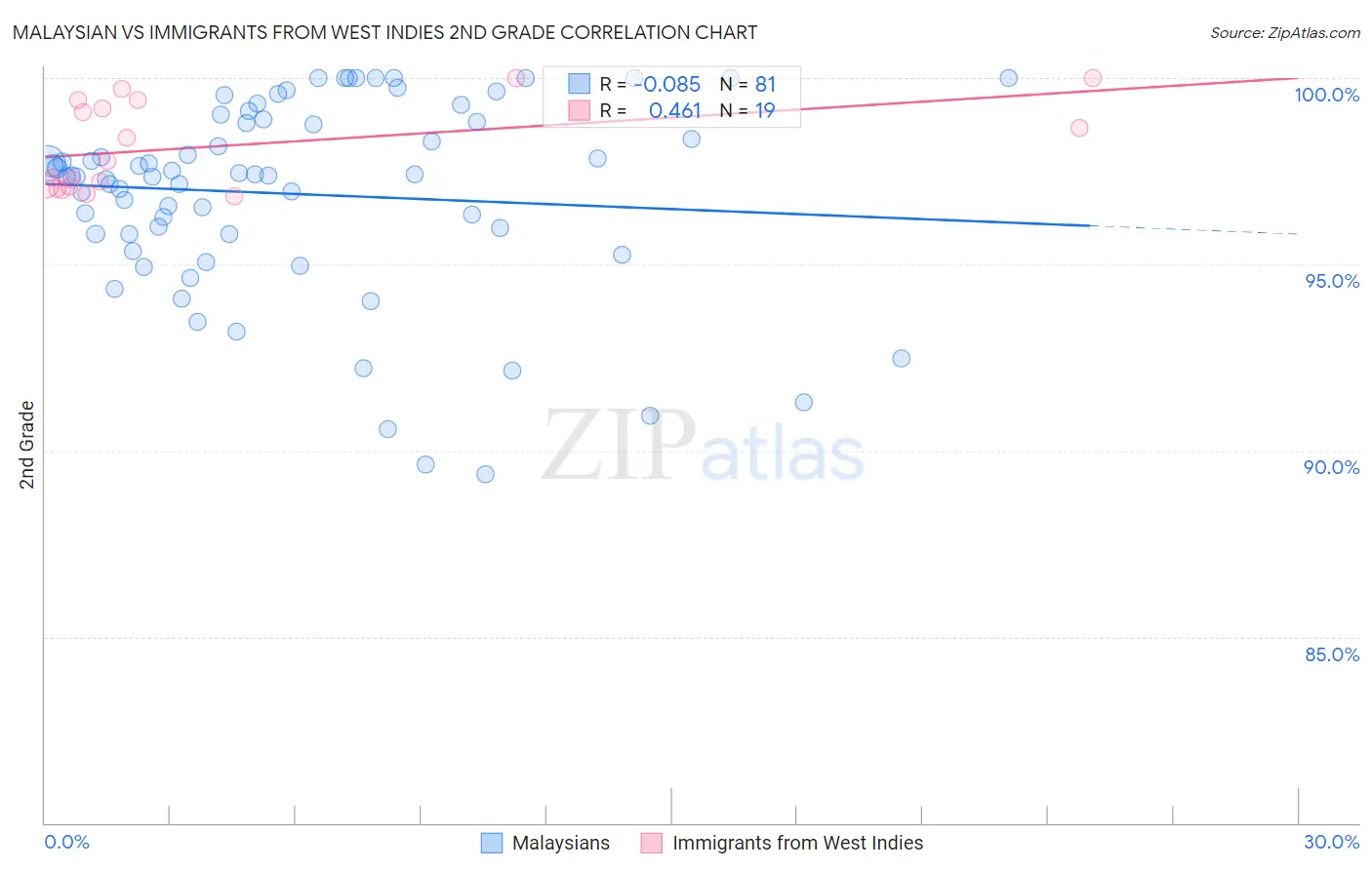 In terms of 2nd grade, the demographic groups most similar to Malaysians are British West Indian (97.2%, a difference of 0.020%), Immigrants from Grenada (97.1%, a difference of 0.020%), Immigrants from Eritrea (97.2%, a difference of 0.040%), Immigrants from Afghanistan (97.2%, a difference of 0.060%), and Immigrants (97.1%, a difference of 0.060%). Similarly, the demographic groups most similar to Immigrants from West Indies are Immigrants from Trinidad and Tobago (97.2%, a difference of 0.010%), Immigrants from Hong Kong (97.2%, a difference of 0.010%), Immigrants from Barbados (97.2%, a difference of 0.020%), Immigrants from Portugal (97.2%, a difference of 0.020%), and Immigrants from Thailand (97.2%, a difference of 0.020%).