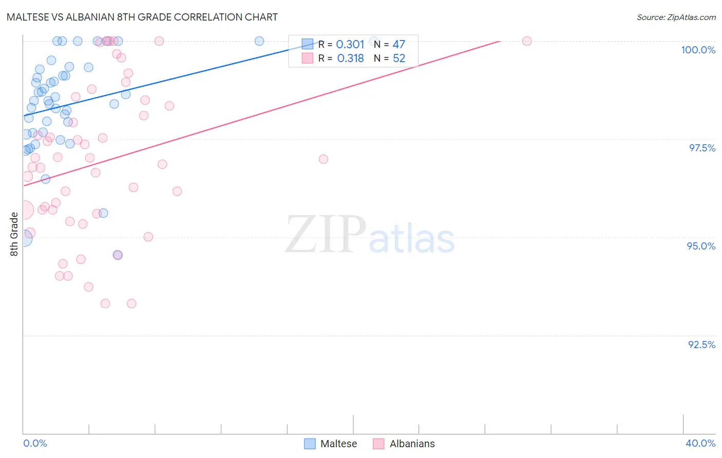 The statistical analysis conducted on geographies consisting of 126,476,608 people shows a mild positive correlation between the proportion of Maltese and percentage of population with at least 8th grade education in the United States with a correlation coefficient (R) of 0.301 and weighted average of 96.9%. Similarly, the statistical analysis conducted on geographies consisting of 193,265,850 people shows a mild positive correlation between the proportion of Albanians and percentage of population with at least 8th grade education in the United States with a correlation coefficient (R) of 0.318 and weighted average of 96.0%, a difference of 0.93%.