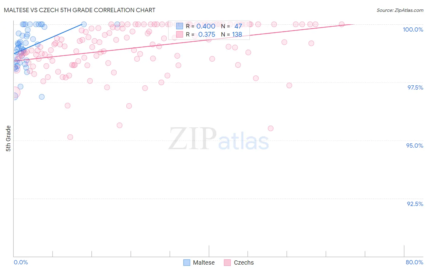 In terms of 5th grade, the demographic groups most similar to Maltese are Slavic (98.0%, a difference of 0.0%), Estonian (98.0%, a difference of 0.010%), Immigrants from Scotland (98.0%, a difference of 0.010%), Celtic (98.0%, a difference of 0.010%), and Australian (98.0%, a difference of 0.010%).