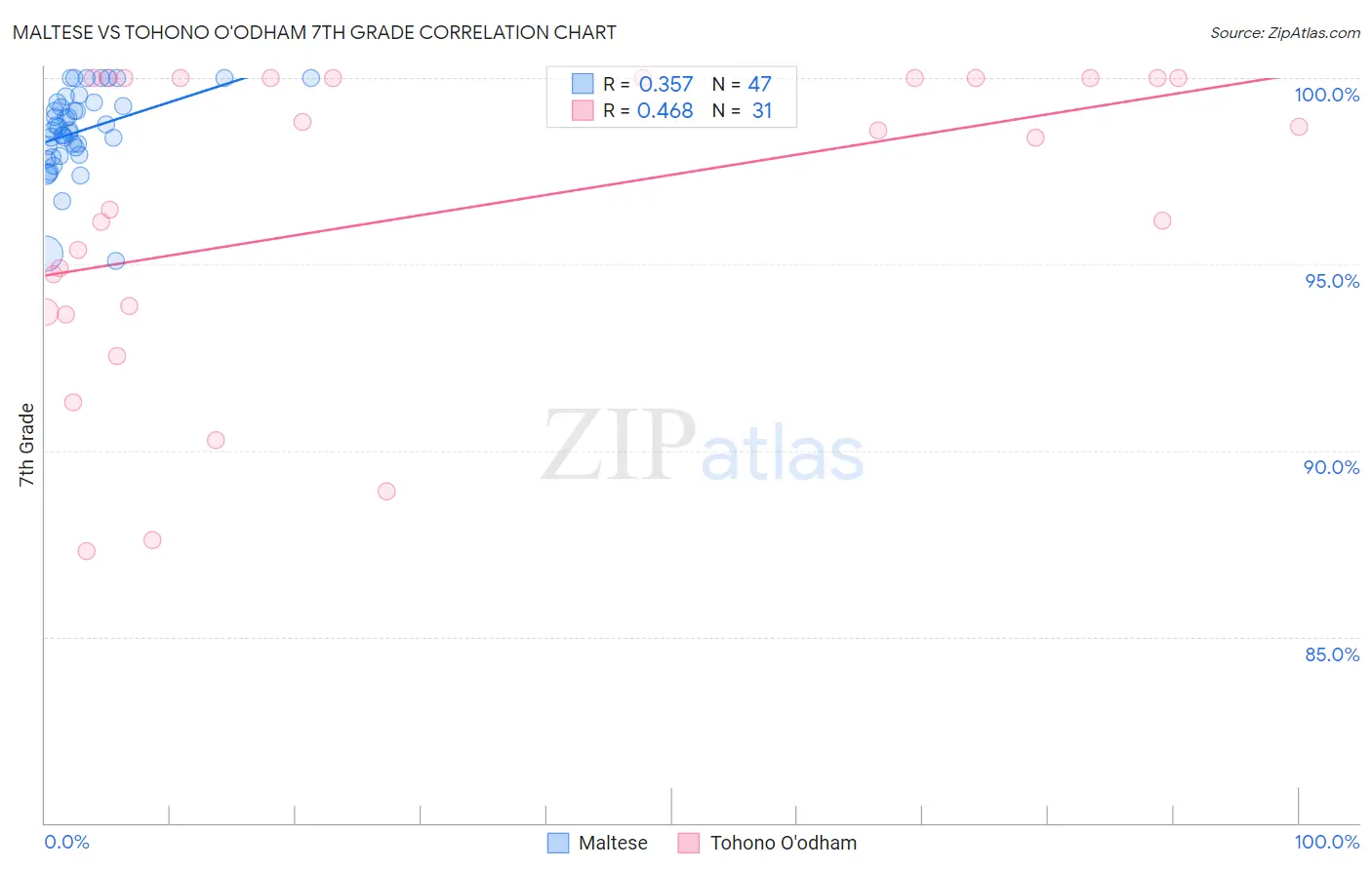 The statistical analysis conducted on geographies consisting of 126,476,608 people shows a mild positive correlation between the proportion of Maltese and percentage of population with at least 7th grade education in the United States with a correlation coefficient (R) of 0.357 and weighted average of 97.1%. Similarly, the statistical analysis conducted on geographies consisting of 58,730,615 people shows a moderate positive correlation between the proportion of Tohono O'odham and percentage of population with at least 7th grade education in the United States with a correlation coefficient (R) of 0.468 and weighted average of 95.0%, a difference of 2.2%.