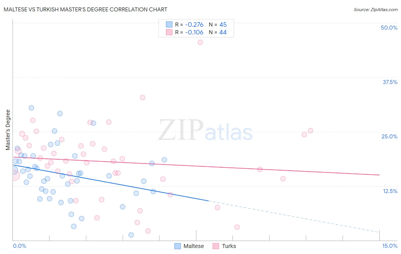 The statistical analysis conducted on geographies consisting of 126,460,442 people shows a weak negative correlation between the proportion of Maltese and percentage of population with at least master's degree education in the United States with a correlation coefficient (R) of -0.276 and weighted average of 17.3%. Similarly, the statistical analysis conducted on geographies consisting of 271,799,708 people shows a poor negative correlation between the proportion of Turks and percentage of population with at least master's degree education in the United States with a correlation coefficient (R) of -0.106 and weighted average of 19.9%, a difference of 15.2%.