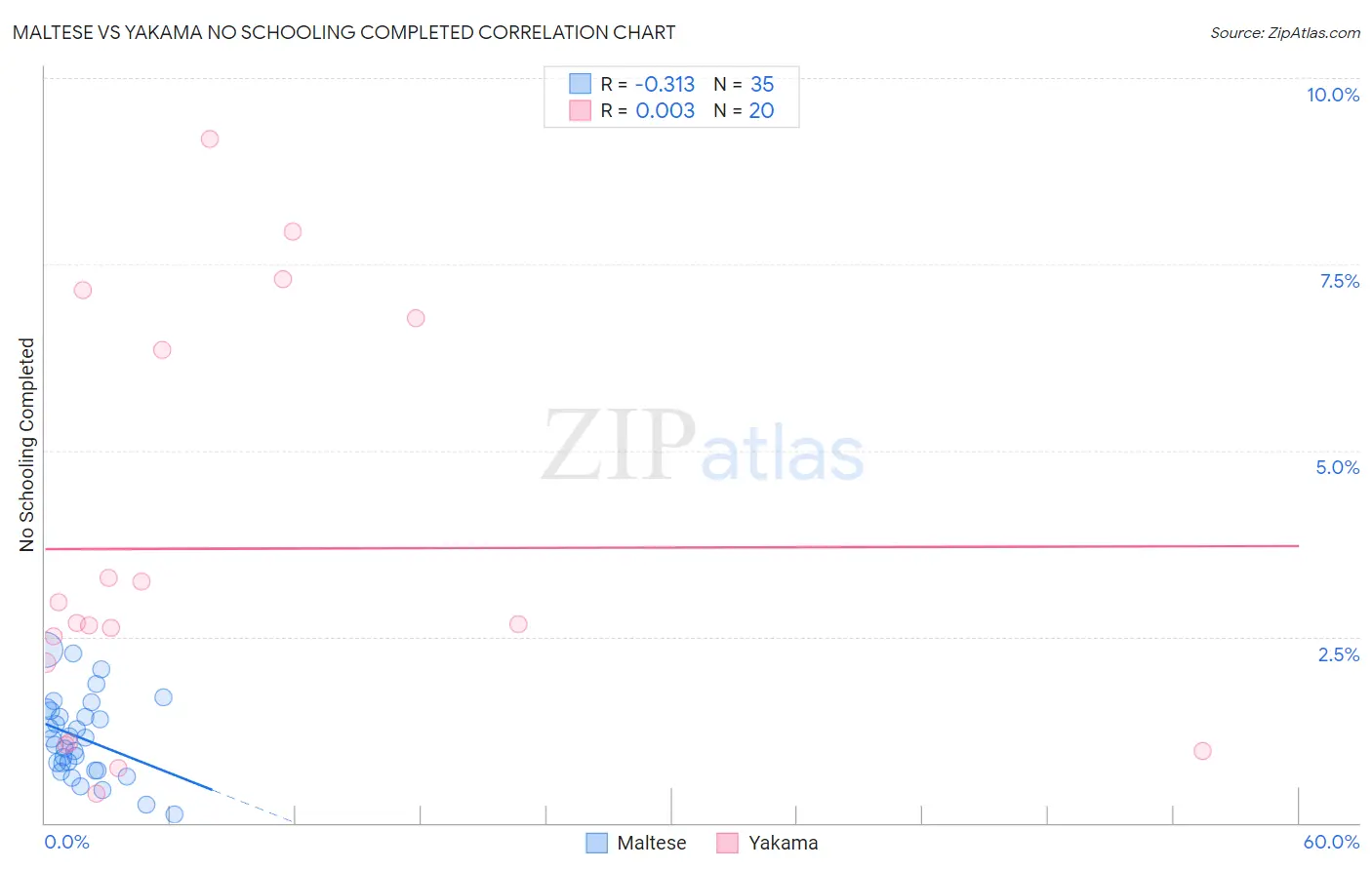 The statistical analysis conducted on geographies consisting of 126,020,620 people shows a mild negative correlation between the proportion of Maltese and percentage of population with no schooling in the United States with a correlation coefficient (R) of -0.313 and weighted average of 1.6%. Similarly, the statistical analysis conducted on geographies consisting of 19,822,084 people shows no correlation between the proportion of Yakama and percentage of population with no schooling in the United States with a correlation coefficient (R) of 0.003 and weighted average of 3.6%, a difference of 118.9%.