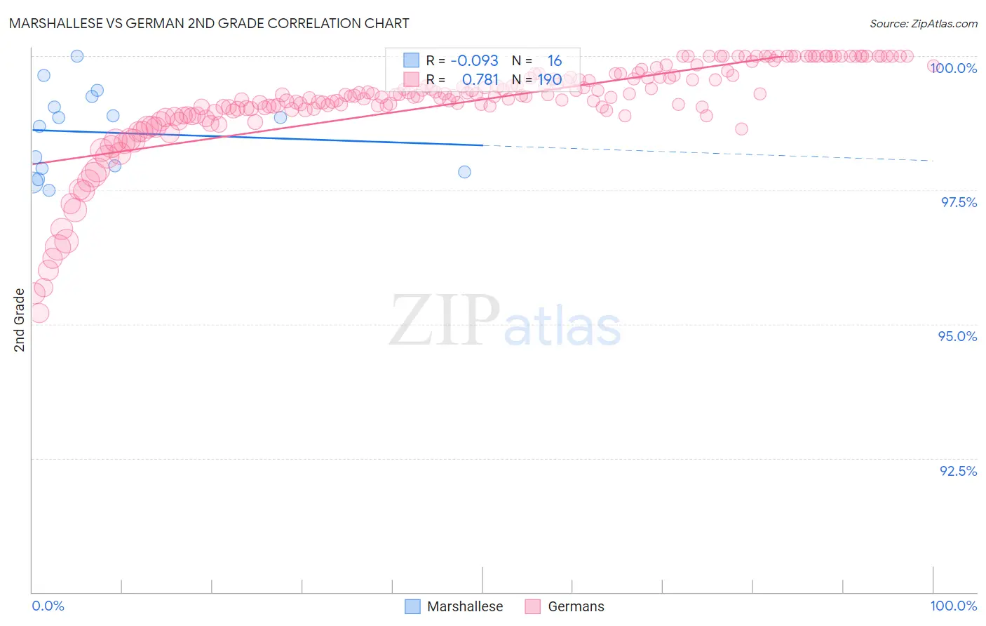 The statistical analysis conducted on geographies consisting of 14,761,315 people shows a slight negative correlation between the proportion of Marshallese and percentage of population with at least 2nd grade education in the United States with a correlation coefficient (R) of -0.093 and weighted average of 97.9%. Similarly, the statistical analysis conducted on geographies consisting of 581,302,427 people shows a strong positive correlation between the proportion of Germans and percentage of population with at least 2nd grade education in the United States with a correlation coefficient (R) of 0.781 and weighted average of 98.7%, a difference of 0.75%.