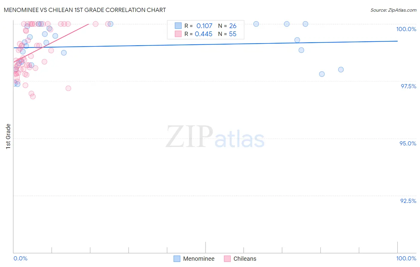In terms of 1st grade, the demographic groups most similar to Menominee are Immigrants from Zimbabwe (98.1%, a difference of 0.0%), Iroquois (98.1%, a difference of 0.0%), Syrian (98.1%, a difference of 0.0%), Immigrants from Japan (98.1%, a difference of 0.0%), and Thai (98.1%, a difference of 0.010%).