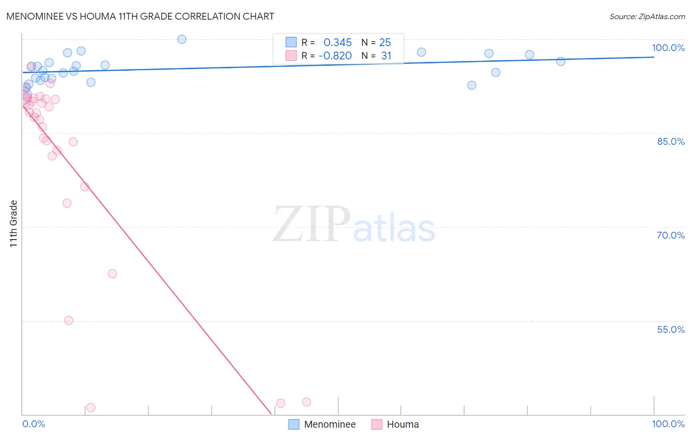 The statistical analysis conducted on geographies consisting of 45,778,829 people shows a mild positive correlation between the proportion of Menominee and percentage of population with at least 11th grade education in the United States with a correlation coefficient (R) of 0.345 and weighted average of 93.5%. Similarly, the statistical analysis conducted on geographies consisting of 36,795,916 people shows a very strong negative correlation between the proportion of Houma and percentage of population with at least 11th grade education in the United States with a correlation coefficient (R) of -0.820 and weighted average of 87.0%, a difference of 7.5%.