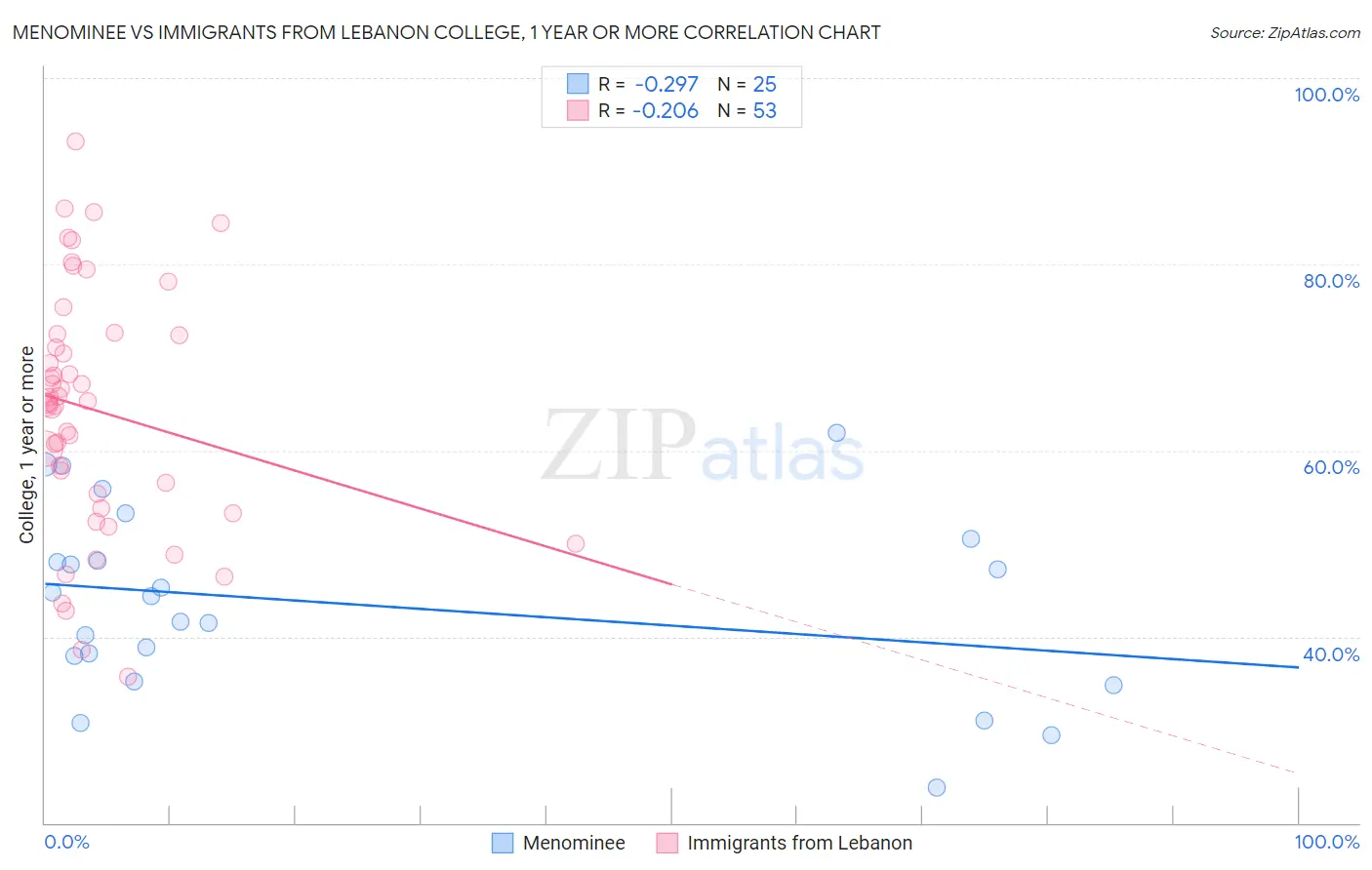 Menominee vs Immigrants from Lebanon College, 1 year or more Correlation Chart