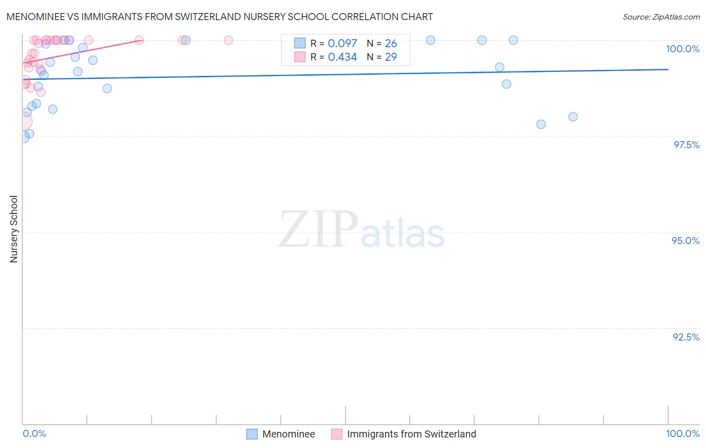 Menominee vs Immigrants from Switzerland Nursery School Correlation Chart