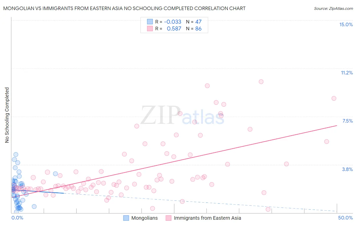 Mongolian vs Immigrants from Eastern Asia No Schooling Completed Correlation Chart