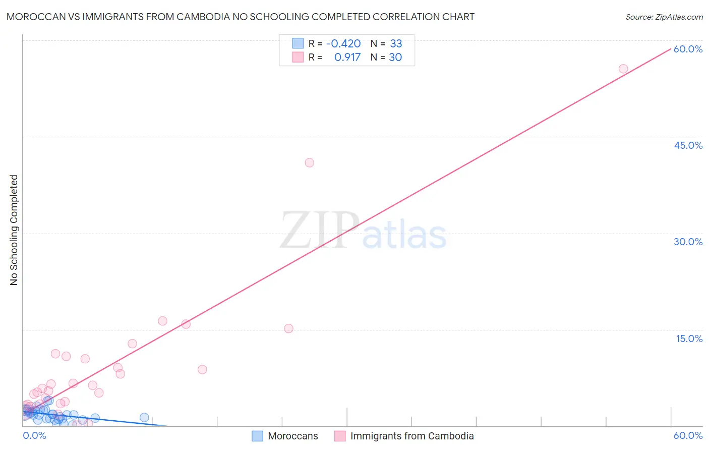 Moroccan vs Immigrants from Cambodia No Schooling Completed Correlation Chart