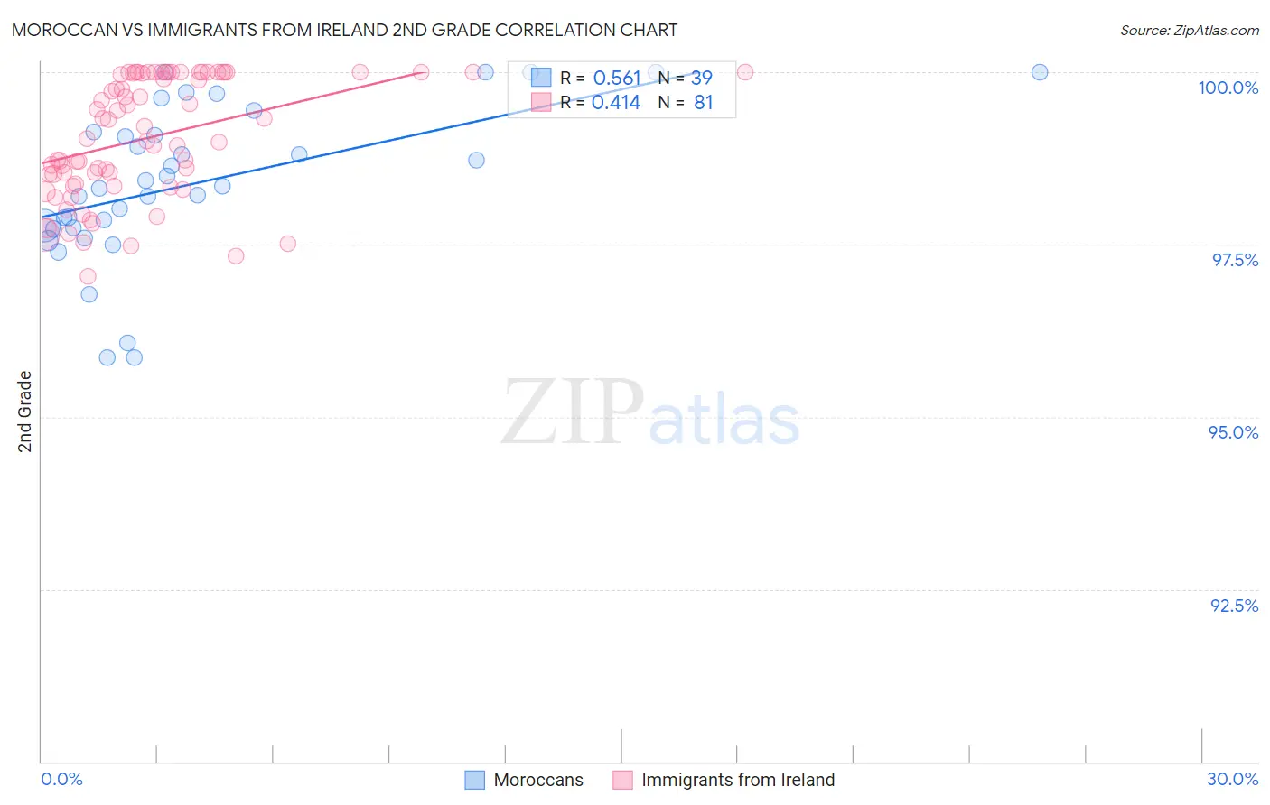 Moroccan vs Immigrants from Ireland 2nd Grade Correlation Chart