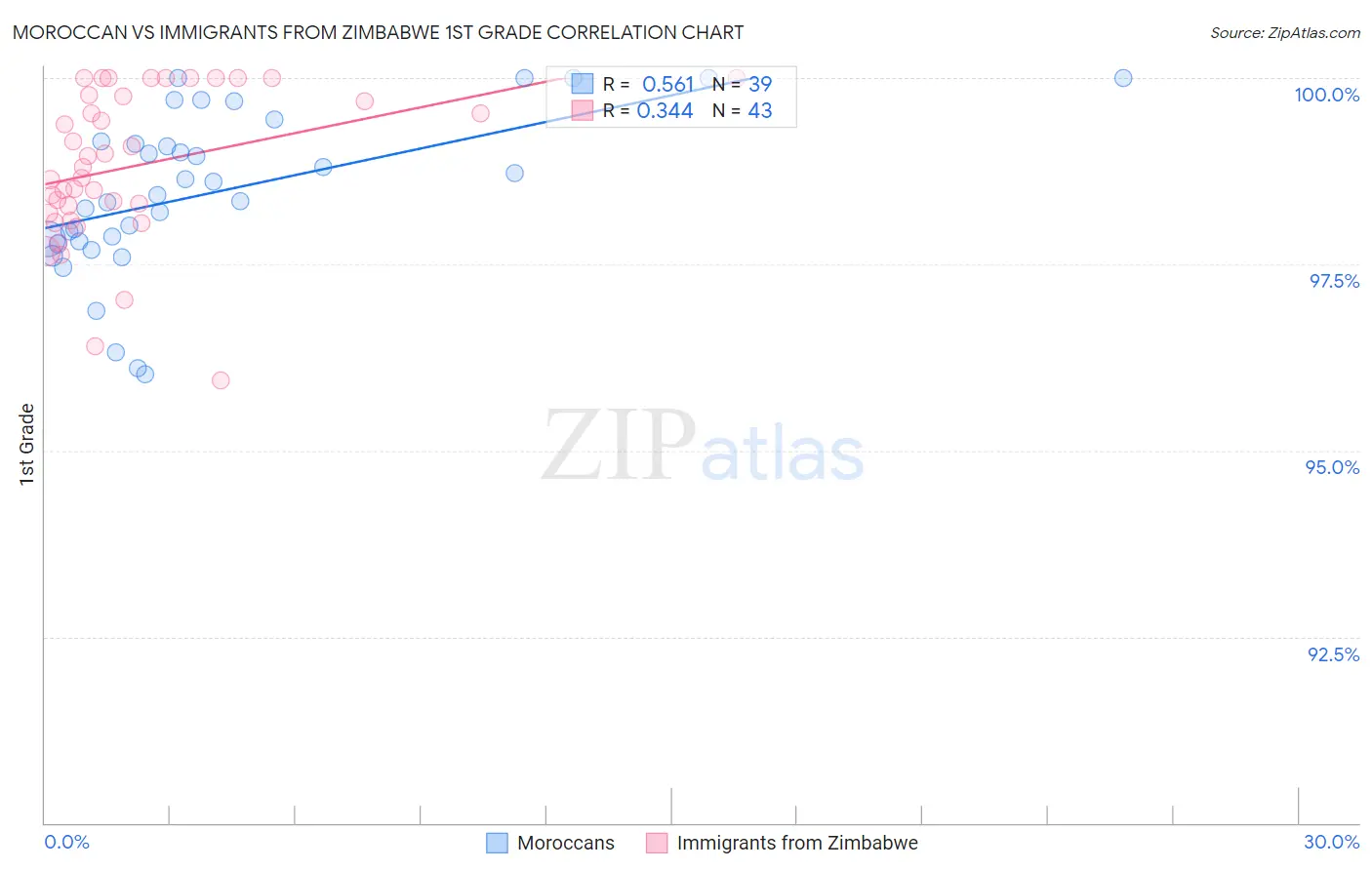 Moroccan vs Immigrants from Zimbabwe 1st Grade Correlation Chart