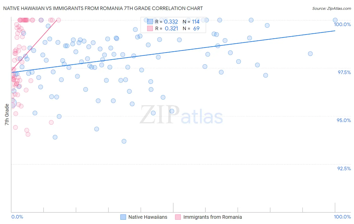 Native Hawaiian vs Immigrants from Romania 7th Grade Correlation Chart