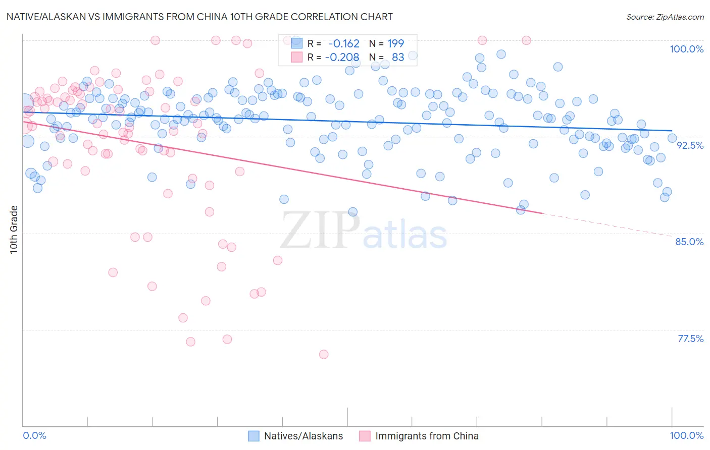 Native/Alaskan vs Immigrants from China 10th Grade Correlation Chart