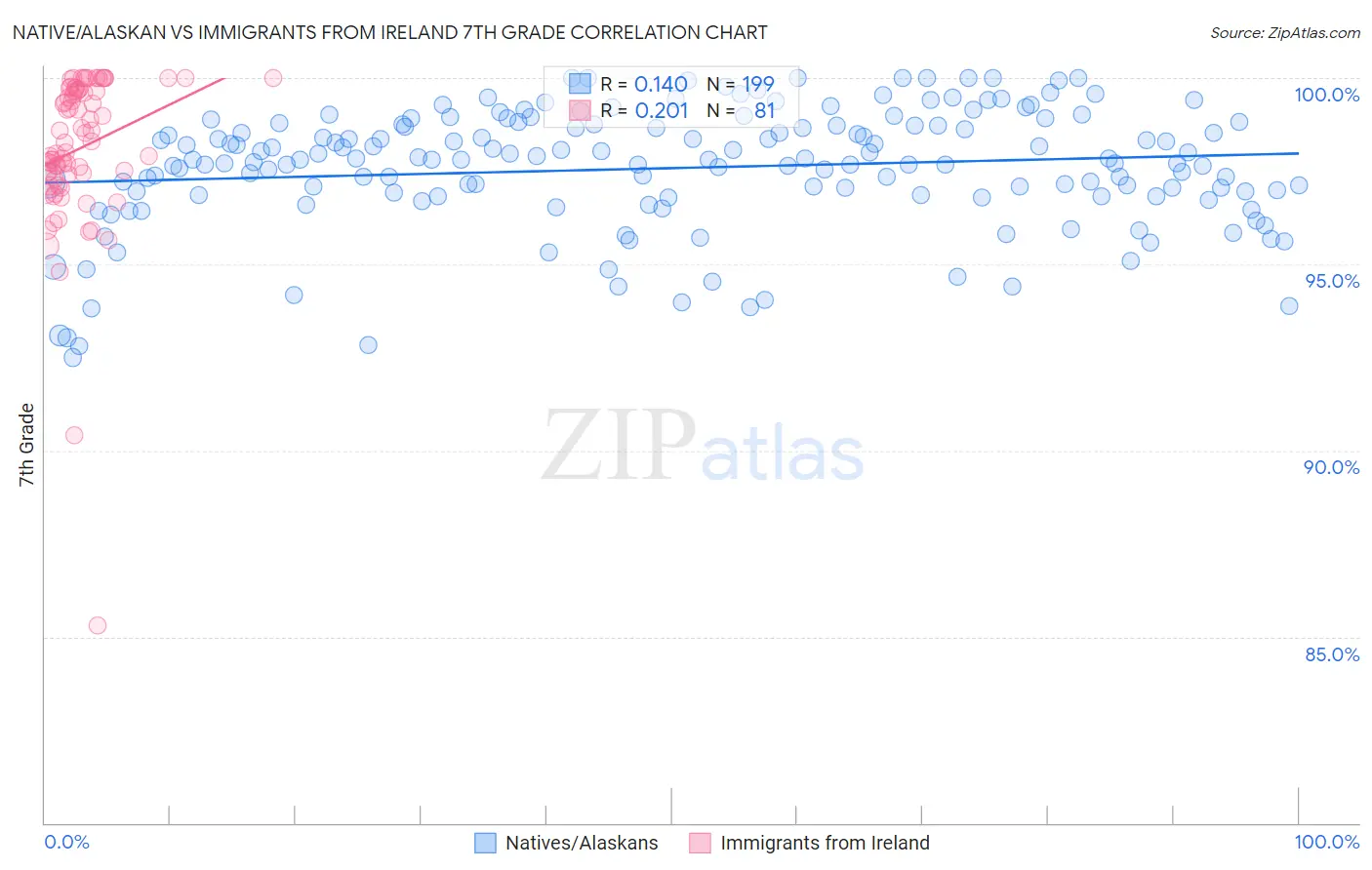 Native/Alaskan vs Immigrants from Ireland 7th Grade Correlation Chart