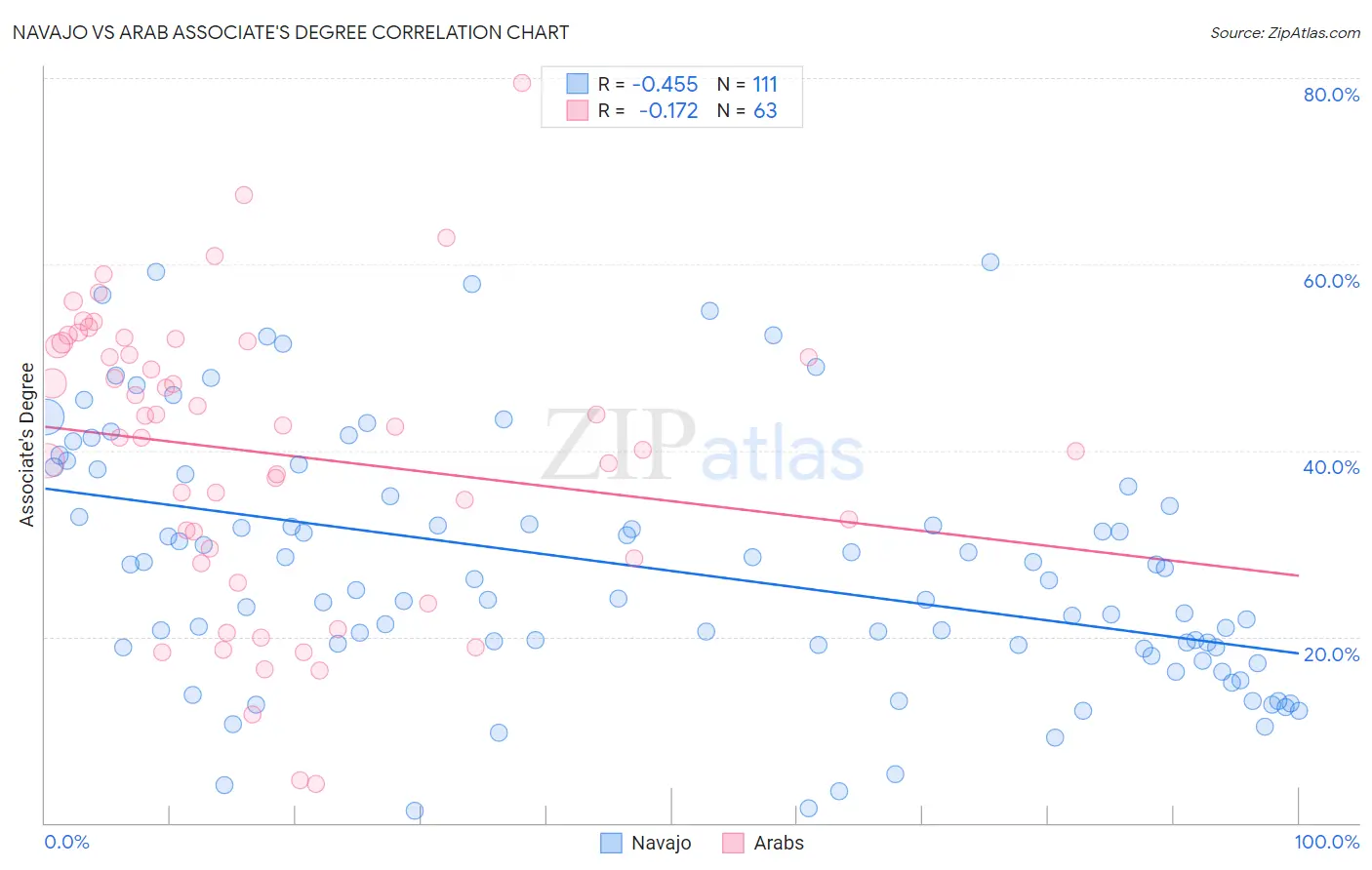 The statistical analysis conducted on geographies consisting of 224,870,654 people shows a moderate negative correlation between the proportion of Navajo and percentage of population with at least associate's degree education in the United States with a correlation coefficient (R) of -0.455 and weighted average of 32.6%. Similarly, the statistical analysis conducted on geographies consisting of 486,836,450 people shows a poor negative correlation between the proportion of Arabs and percentage of population with at least associate's degree education in the United States with a correlation coefficient (R) of -0.172 and weighted average of 49.0%, a difference of 50.3%.