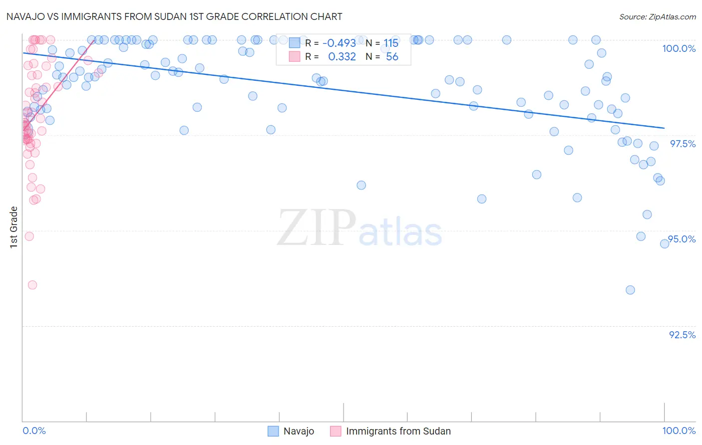 Navajo vs Immigrants from Sudan 1st Grade Correlation Chart