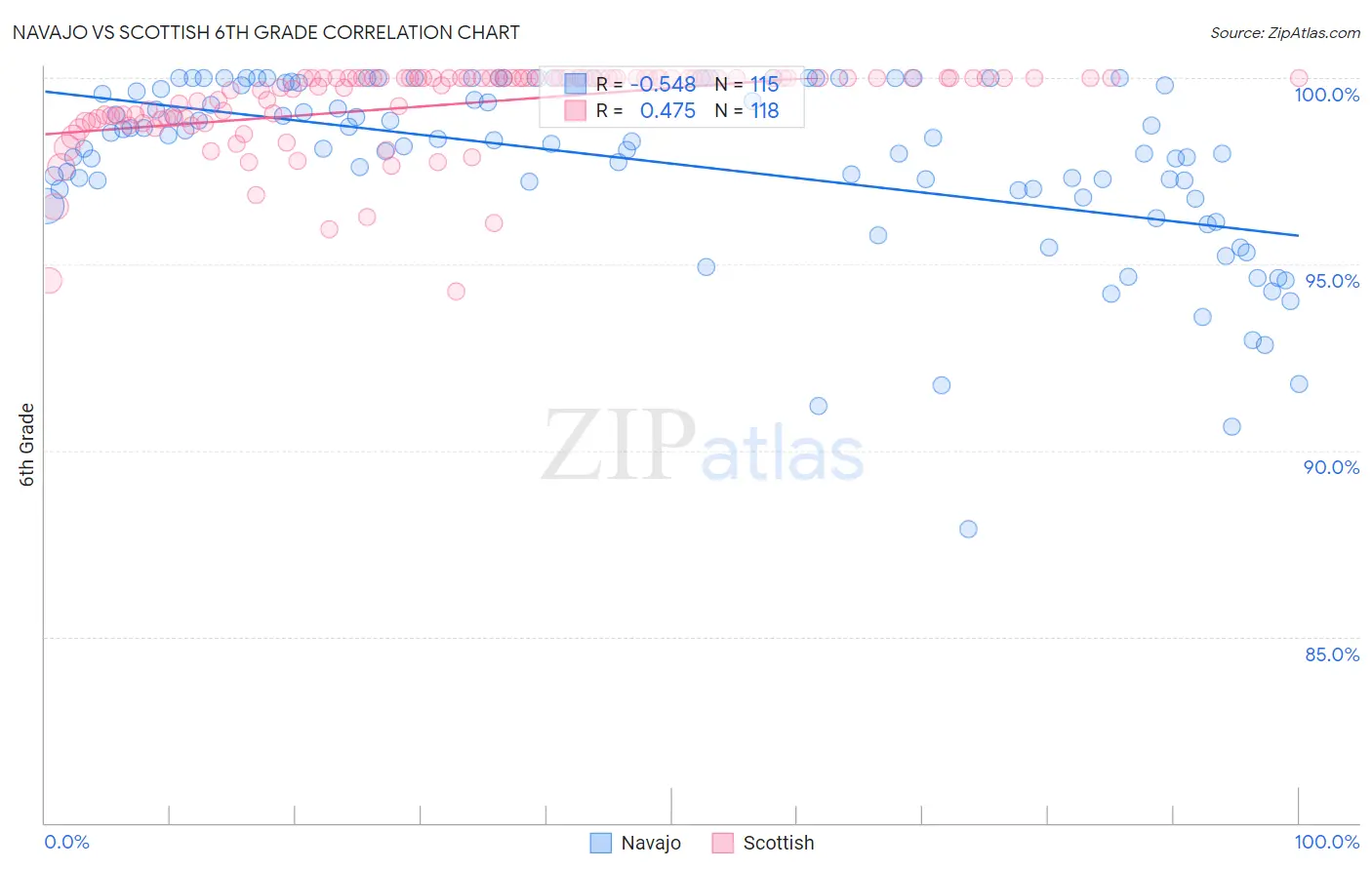 The statistical analysis conducted on geographies consisting of 224,872,927 people shows a substantial negative correlation between the proportion of Navajo and percentage of population with at least 6th grade education in the United States with a correlation coefficient (R) of -0.548 and weighted average of 96.8%. Similarly, the statistical analysis conducted on geographies consisting of 567,141,733 people shows a moderate positive correlation between the proportion of Scottish and percentage of population with at least 6th grade education in the United States with a correlation coefficient (R) of 0.475 and weighted average of 98.1%, a difference of 1.4%.