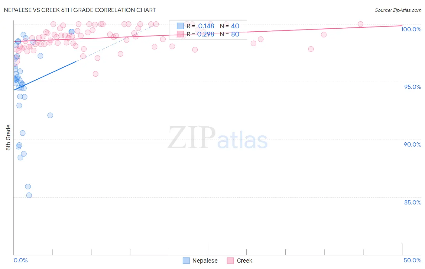 The statistical analysis conducted on geographies consisting of 24,521,755 people shows a poor positive correlation between the proportion of Nepalese and percentage of population with at least 6th grade education in the United States with a correlation coefficient (R) of 0.148 and weighted average of 94.9%. Similarly, the statistical analysis conducted on geographies consisting of 178,480,663 people shows a weak positive correlation between the proportion of Creek and percentage of population with at least 6th grade education in the United States with a correlation coefficient (R) of 0.298 and weighted average of 97.7%, a difference of 3.0%.