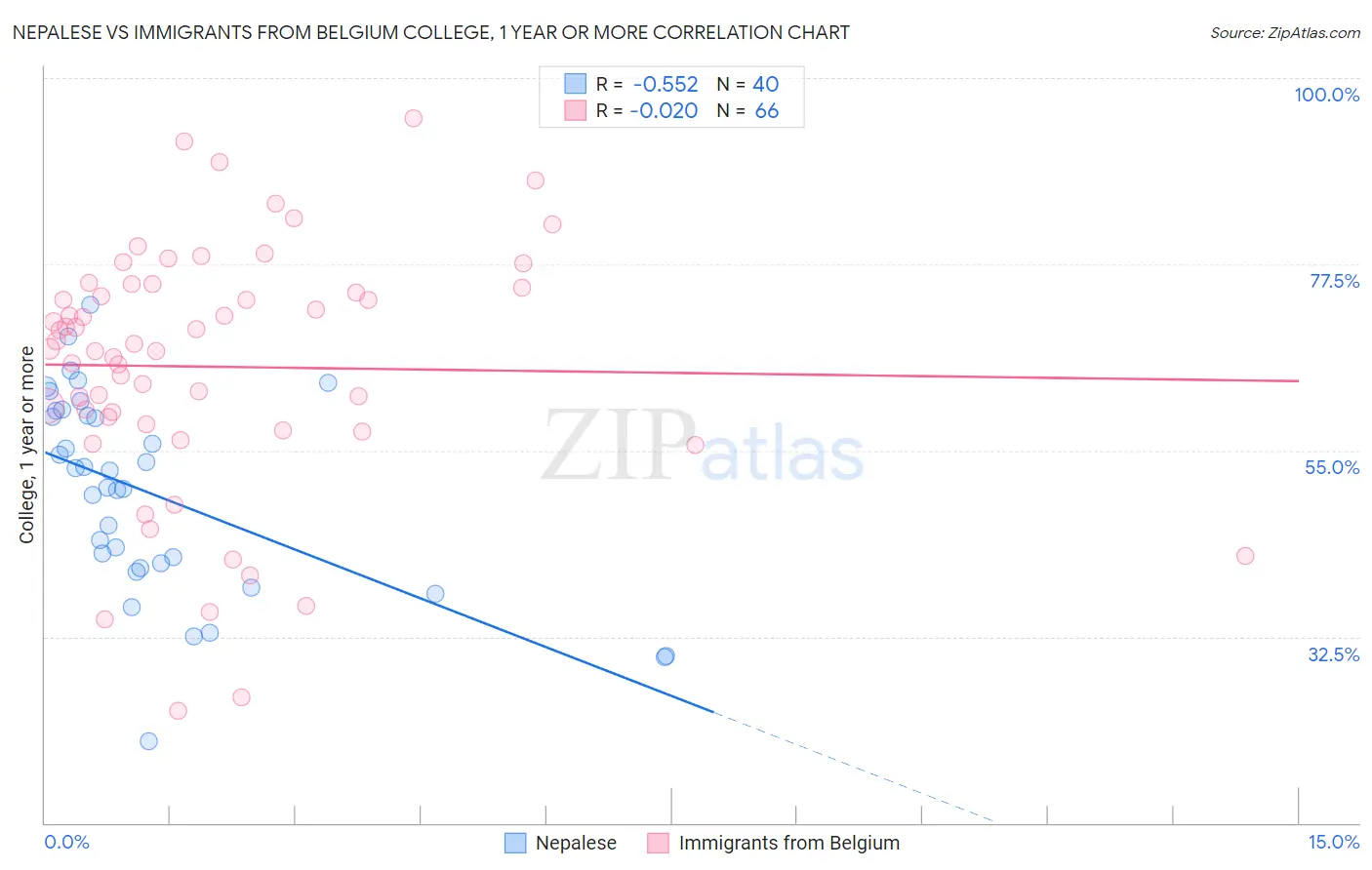 Nepalese vs Immigrants from Belgium College, 1 year or more Correlation Chart